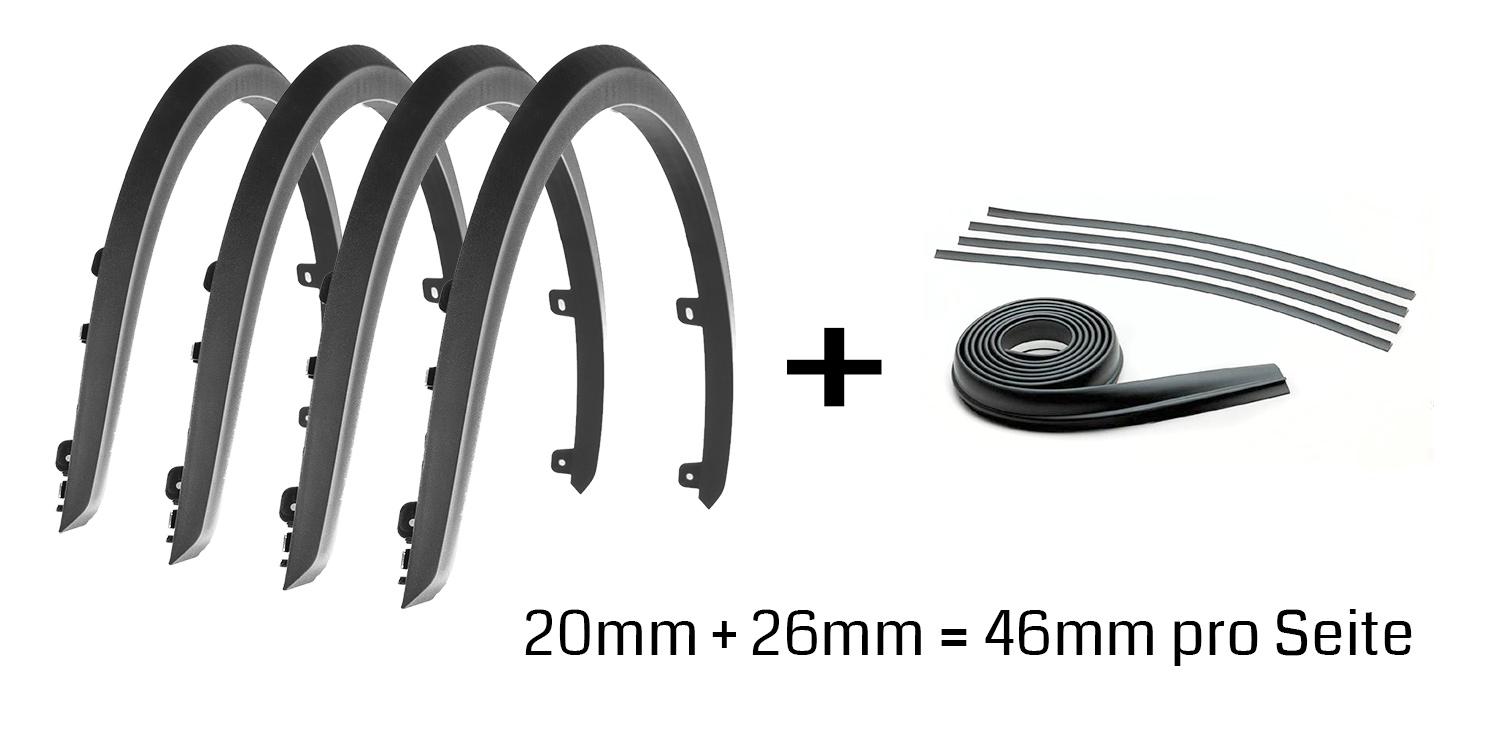 Lieferumfang: 4 Stück 20mm-Kunststoff-Kotflügelverbreiterung ohne Schrauben (Verwenden Sie die an Ihrem Fzg vorhandenen Schrauben) und ein Set aus 4 Universalverbreiterungen (Gummi, selbstklebend) in Breite 26mm