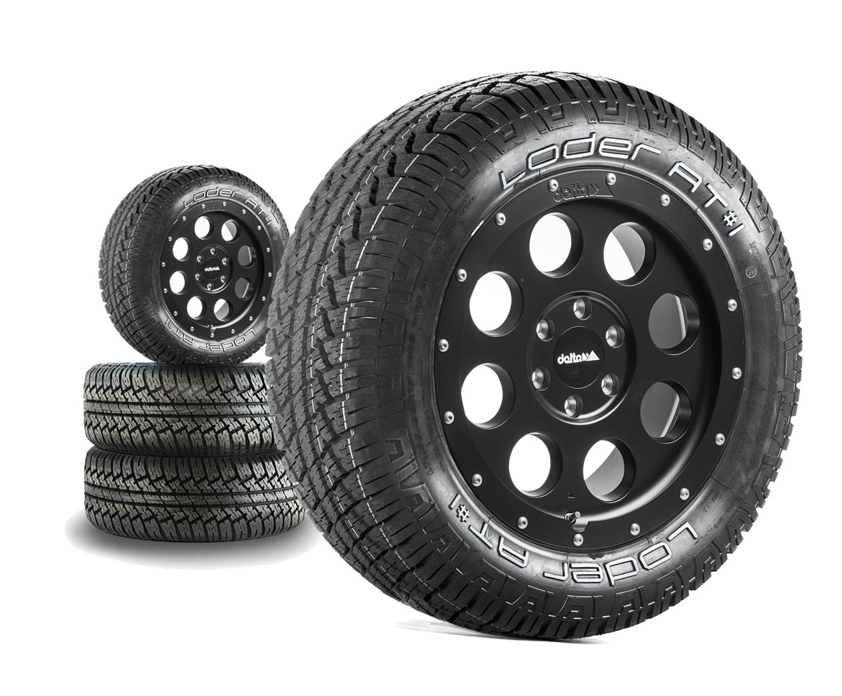 | Lieferumfang | 4 Aluräder Klassik_B mit Lodertire AT#1, Montage und Wuchten, Gutachten; (inkl. Fracht in D) |